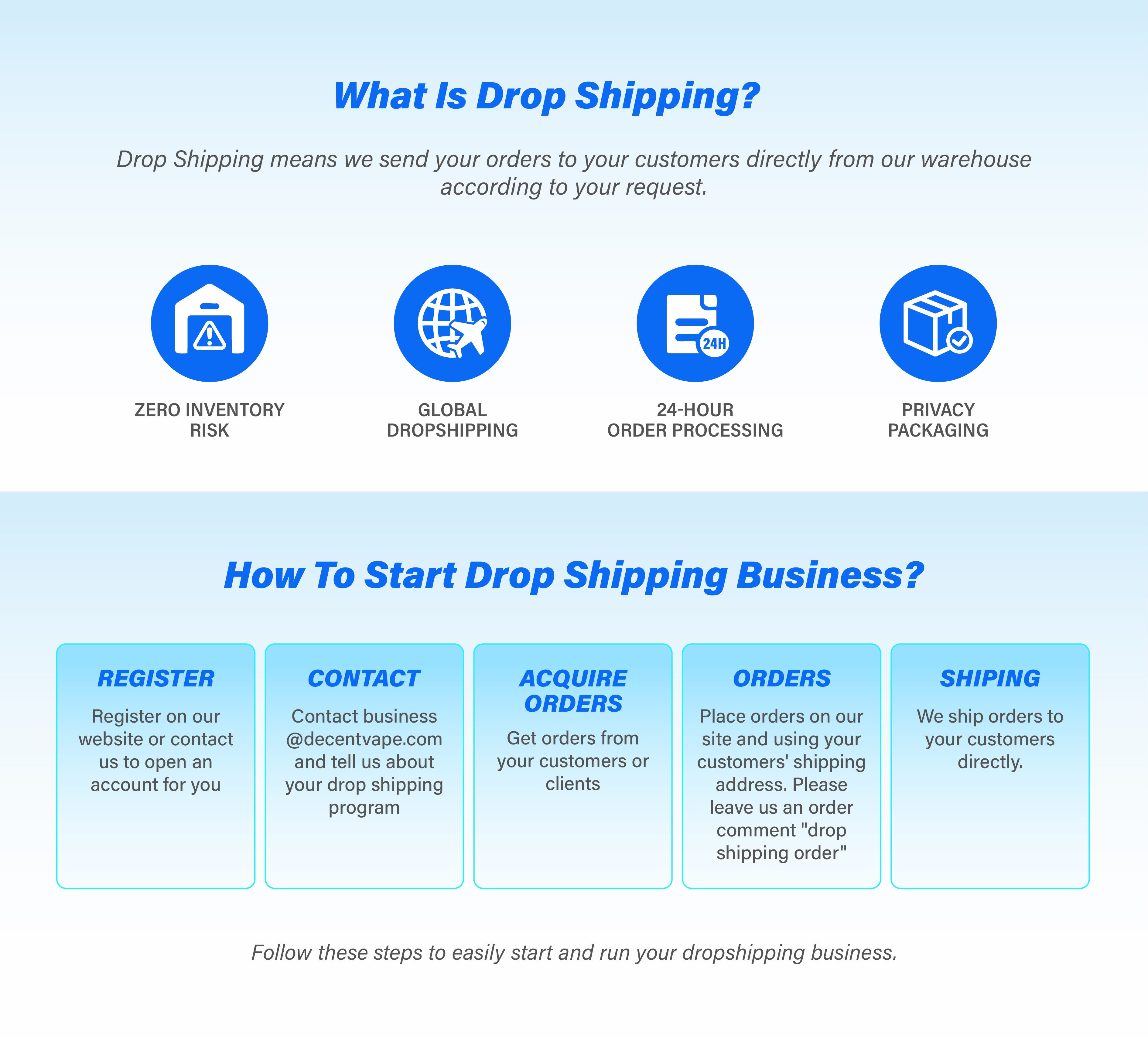 We will make sure Logo or company name of Decent Vape will not mentioned anywhere on the product package. Your customers information will be fully protected without leakage to any third-party except for our shipping forwarder.